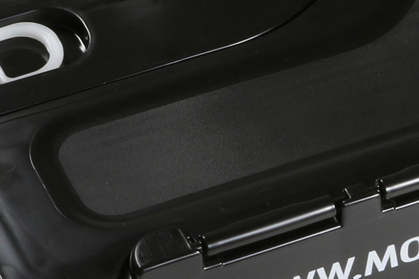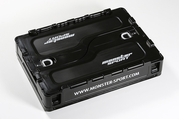 汚れが目立ち難いブラックのケースに、アクセントとして赤とグレーが映える「MONSTER SPORT」ロゴをプリント。