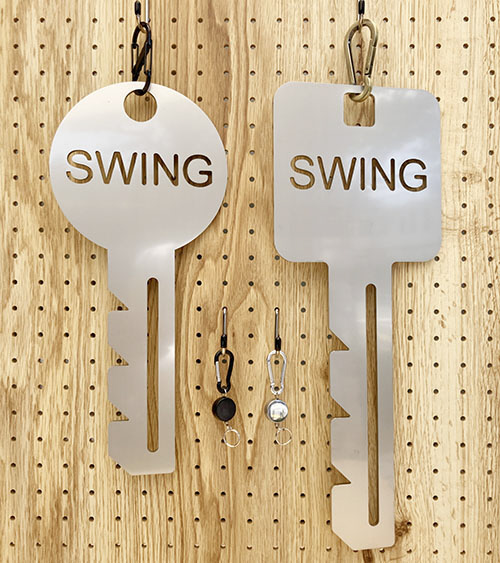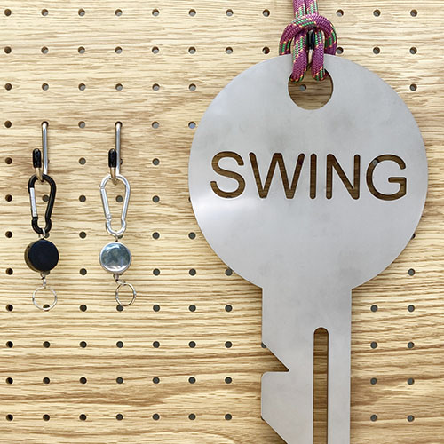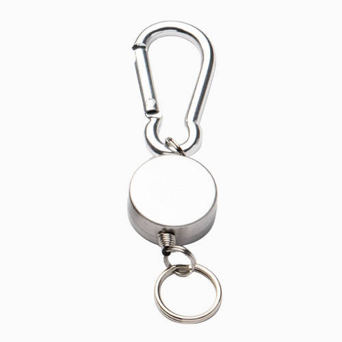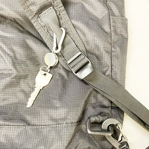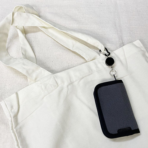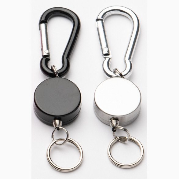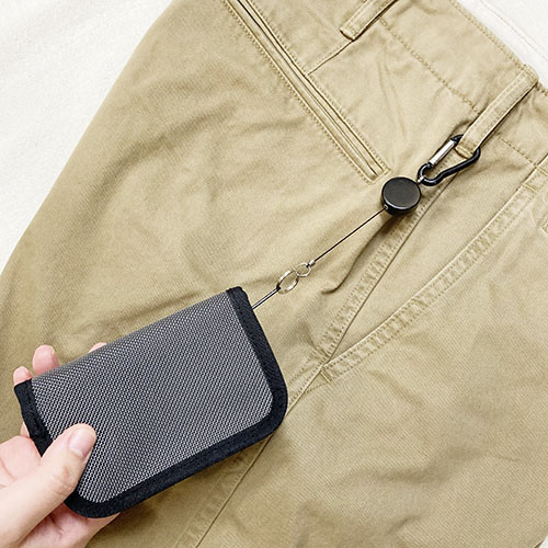先端部分が伸縮するキーホルダーです。先端を引っ張ると巻き取り式のワイヤーが伸び縮みします。鞄やベルトにつけたまま鍵やパスケースが使えるようになります。小物の紛失防止としても。