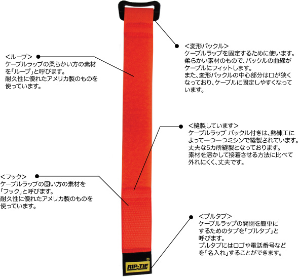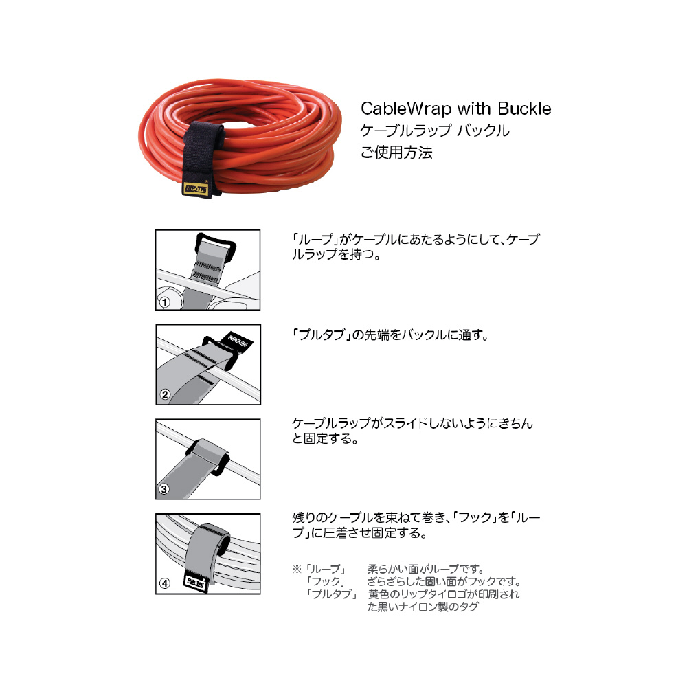 耐久使用回数は1万回以上!プロの現場で活躍するRIP-TIEのケーブルラップ。後端のバックルにストラップを通し、ケーブルに固定するデザイン。ケーブル径に関係なく取り付けが可能です。