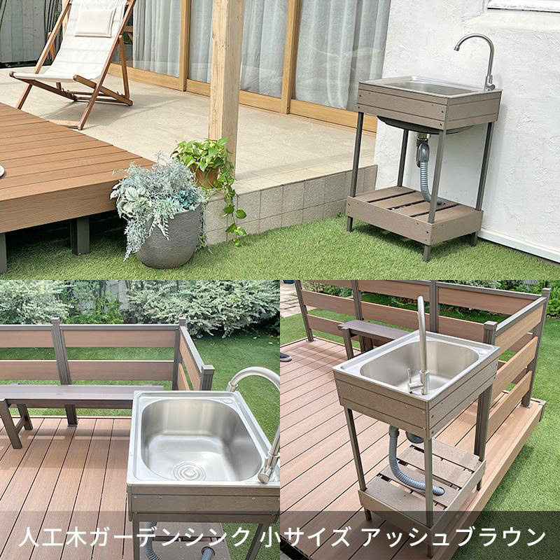 旭興進オリジナルの人工木とステンレスを使用した本格的な「人工木ガーデンシンク」が登場!ガーデニング用品のお手入れ、BBQの準備や後片付にも人気のガーデンシンクは「大」「小」の2種類 × 2カラーからお庭やウッドデッキに合わせてご選択頂けます。ワンランク上のガーデンライフの演出に是非、ご活用下さい。