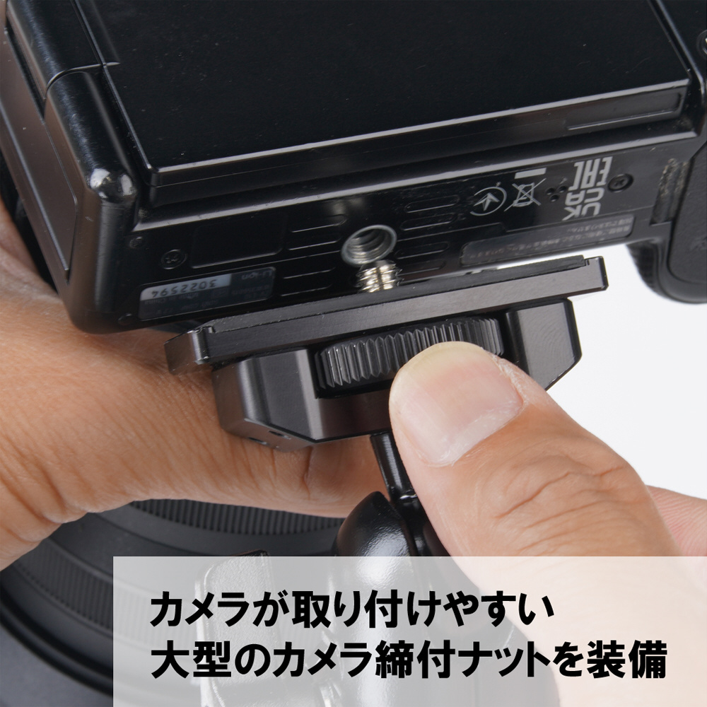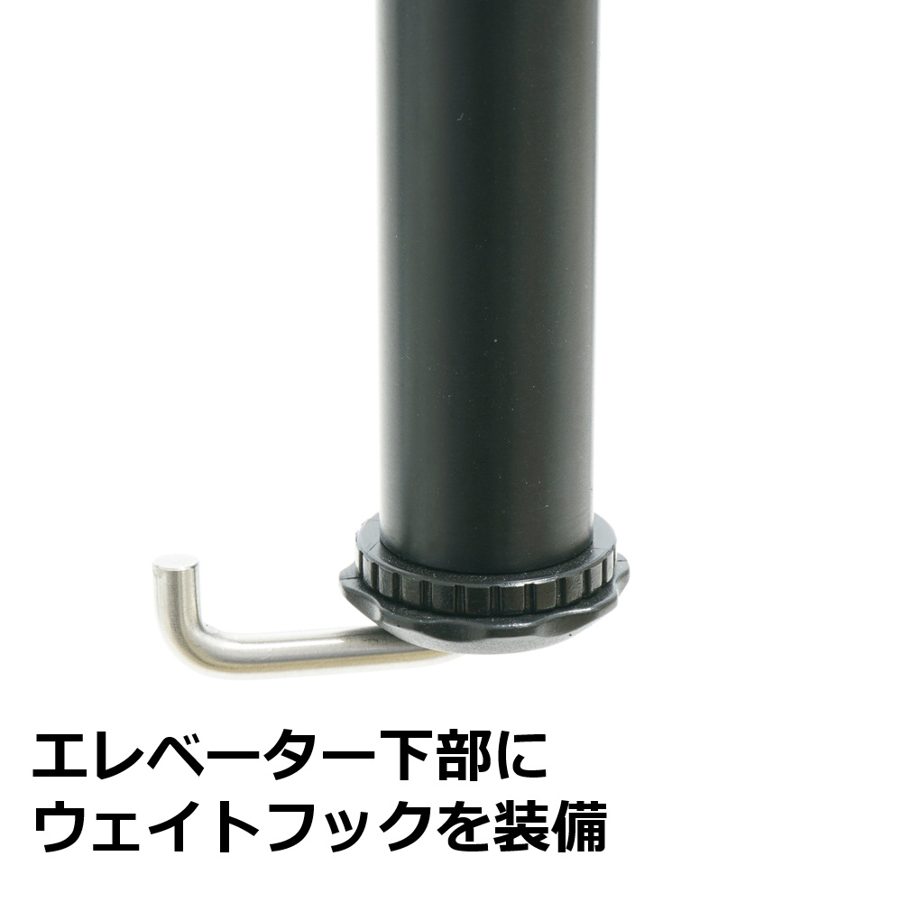 雲台はカメラ台に独立したカメラ締付ナットを装備した、専用雲台を設定。エレベーター下部には、ウェイトフックを装備し、バッグ等を吊るすことで、重心を下げることができます。