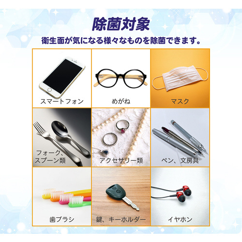 ・歯ブラシ、スマホ、マスク、箸、スプーン、フォーク、アクセサリー、お子様のおもちゃ、赤ちゃん用小物など様々なものの除菌に。