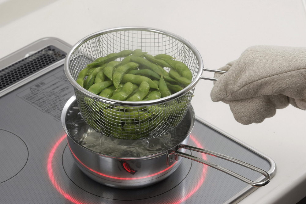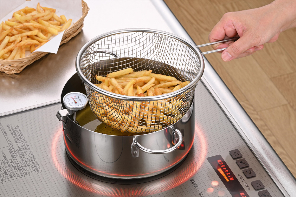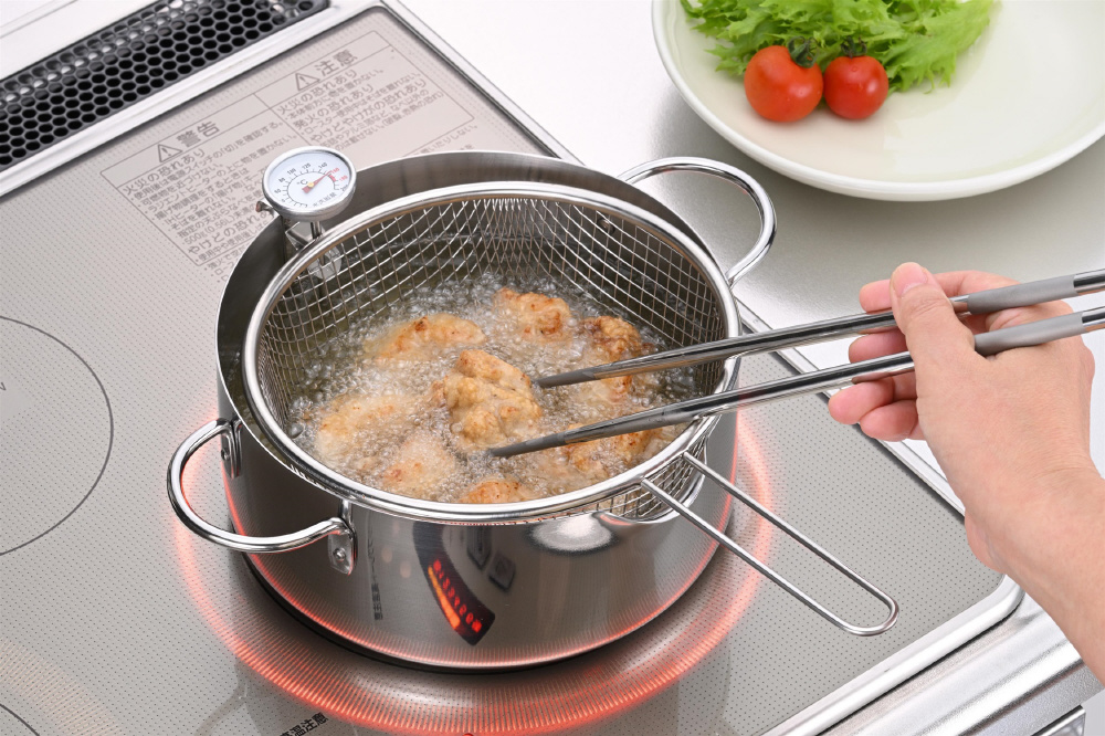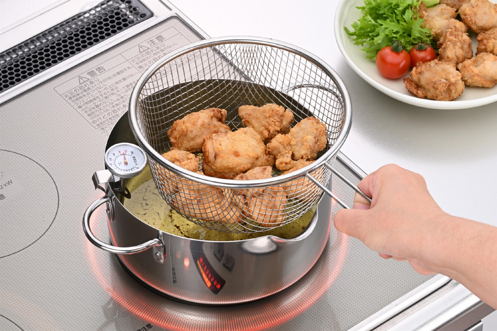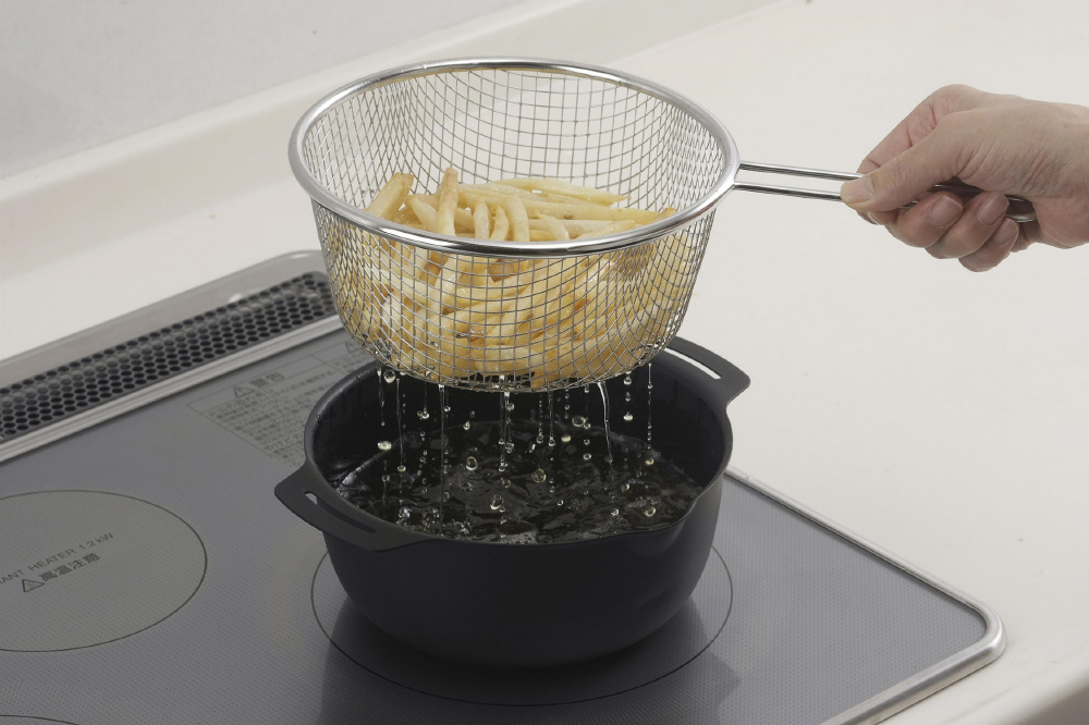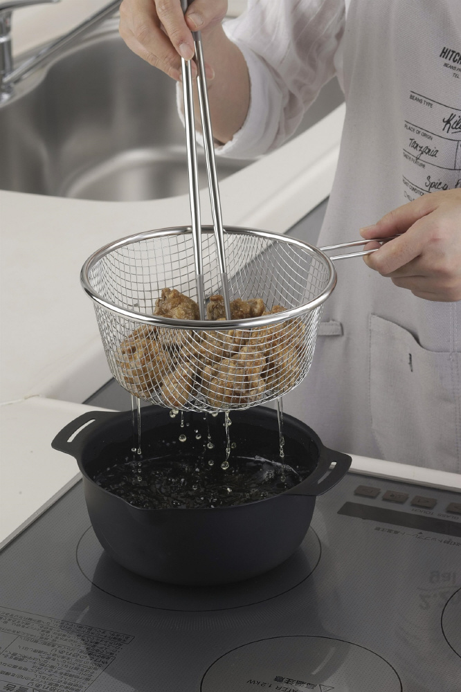 18cmサイズの鍋や揚げ鍋にセット、持ち上げるだけで水&油切りができます。