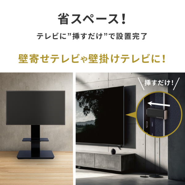 ケーブルやコンセントは不要、テレビの背面に挿すだけで手軽に設置できるので、壁掛けテレビや壁寄せテレビとのご使用もおすすめです。