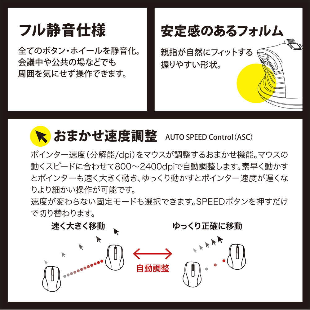 ポインター速度(分解能/dpi)をマウスが調整するおまかせ機能。マウスの動くスピードに合わせて800〜2400dpiで自動調整します。素早く動かすとポインターも速く大きく動き、ゆっくり動かすとポインター速度が遅くなりより細かい操作が可能です。