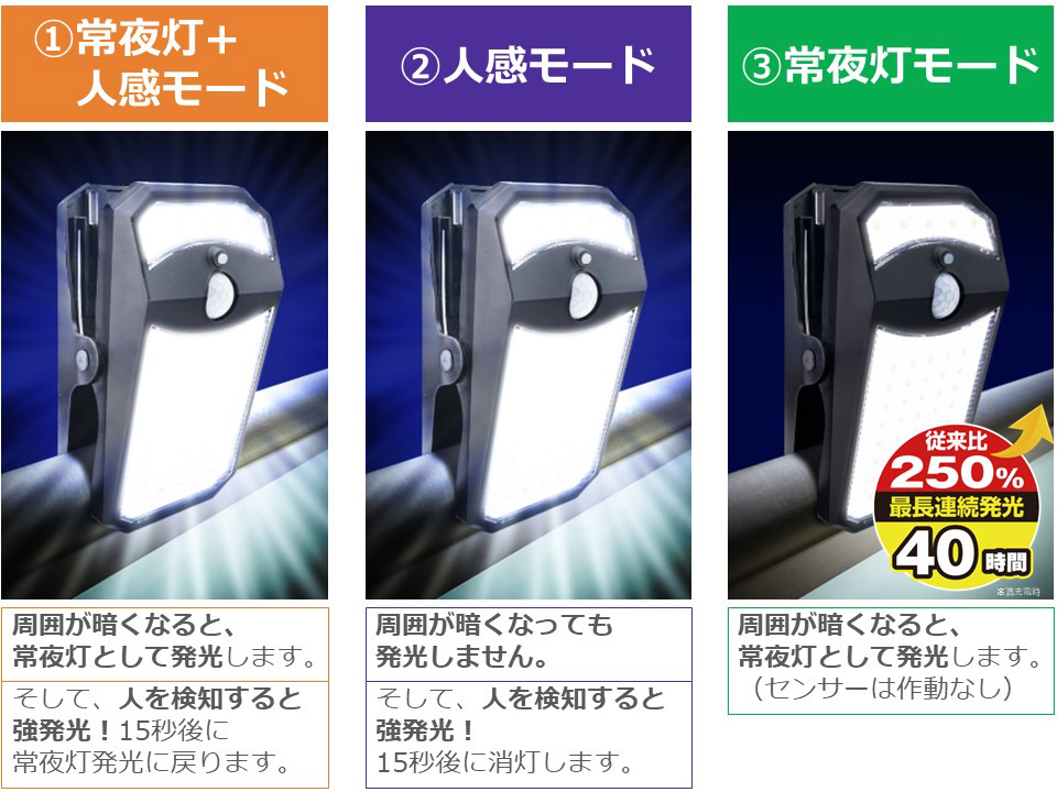 ■Wセンサーによる3つのは発光モードと切替時のアンサーバック機能付き