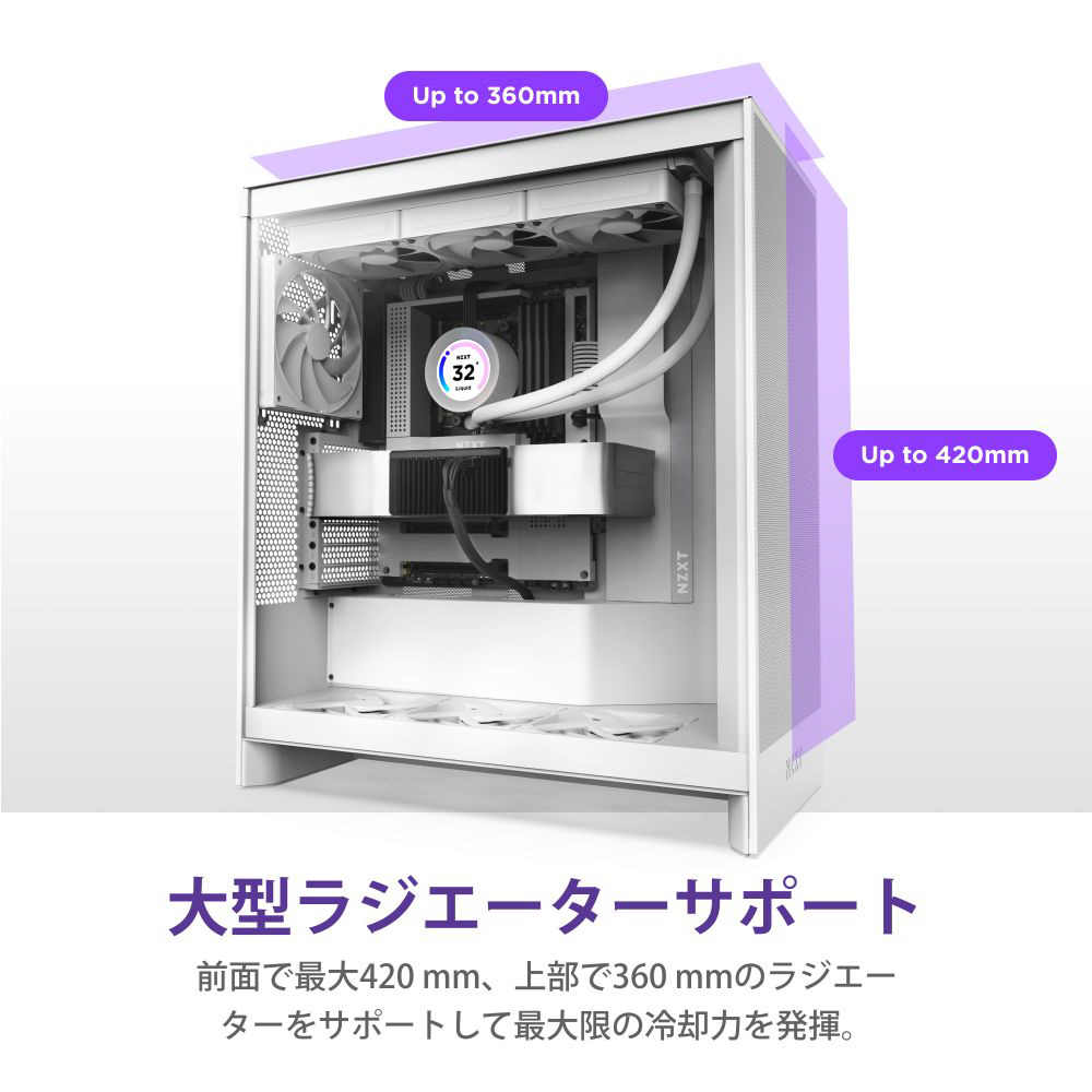 フロントに最大420mm、トップに最大360mm、リアに最大140mmのラジエータ取付をサポートします。