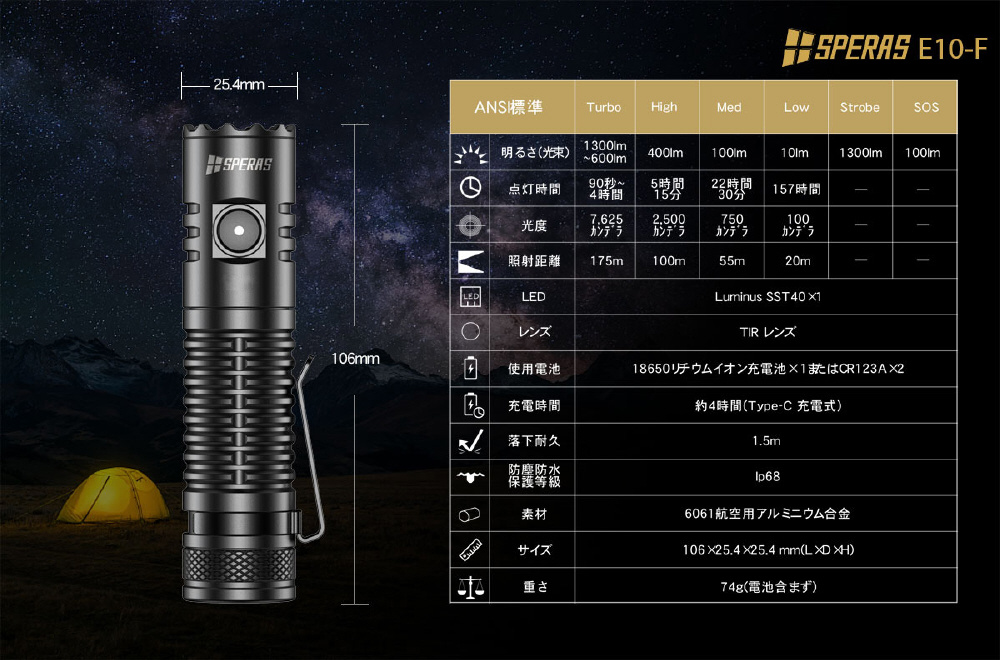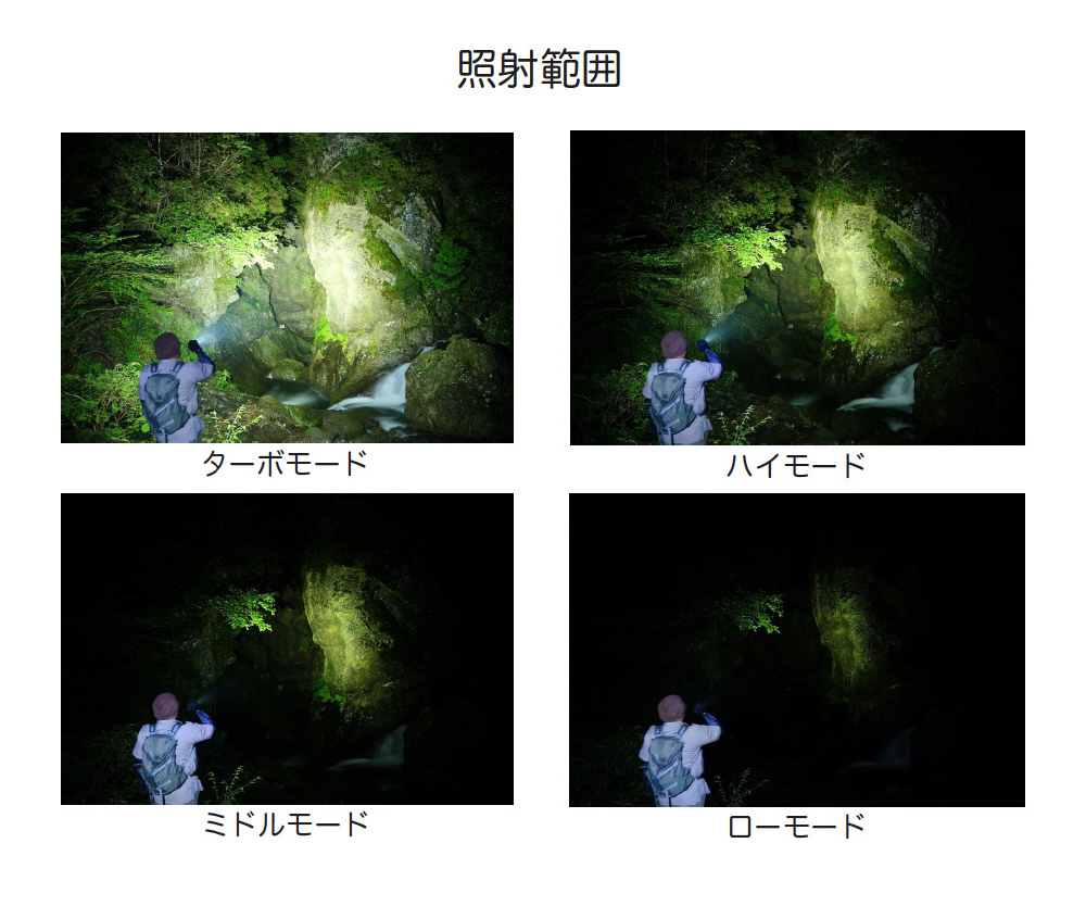 ●点灯・消灯:サイドスイッチを押すとON→OFF→ONと切り替わります。明るさモード記憶機能搭載●モード切替:点灯時、サイドスイッチを長押しするとLow→Med→High→Turboと切り替わります。指を離すと明るさモードが固定されます。