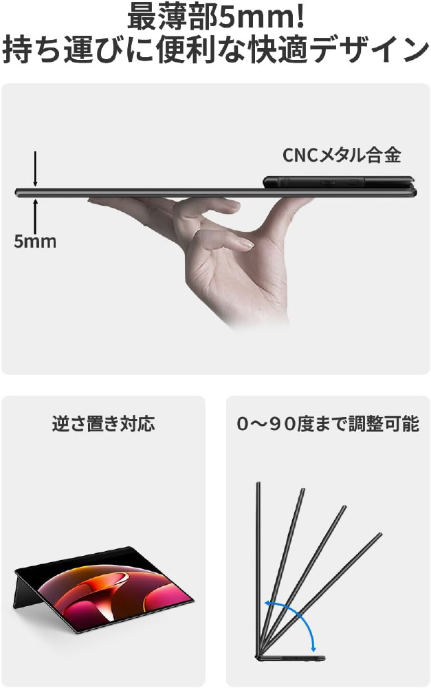 最薄部5mm、コンパクトサイズで、まるでA4ノートを持ち歩く感覚でどこへでもご携帯いただけます。ドライバ等のインストールは不要で、付属のケーブル一本でデバイスと接続可能です。※デバイスによって電源供給が別途必要となります。バッグに入れたり、手持ちでも。ビジネスオフィス/カフェ/旅行先にも簡単に持ち運べ、あらゆるシーンで快適に使用できます。