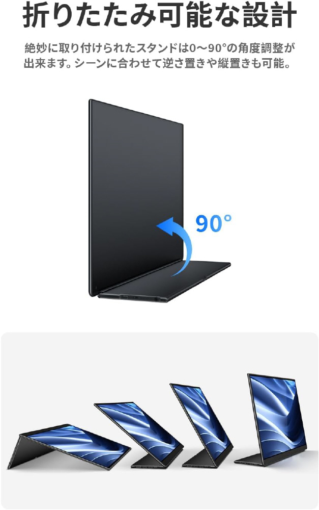折りたたみ可能な入出力ポート付スタンドが本体と直結しております。締め付けすぎず、緩すぎない絶妙な取り付けにより、角度調整もスムーズに行えてラクラク設置できます。Alt mode(Thunderbird3規格)に対応したデバイスにはTypeCケーブル1本で電源給電・映像出力が可能です。