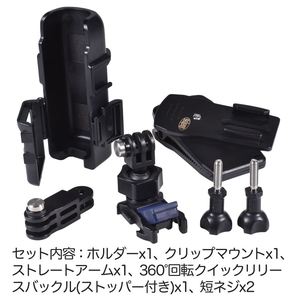 ●セット内容:ホルダー x1、クリップマウント(ベースマウントタイプ)x1、ストレートアームx1、360°回転クイックリリースバックル(ストッパー付き)x1、短ネジx2