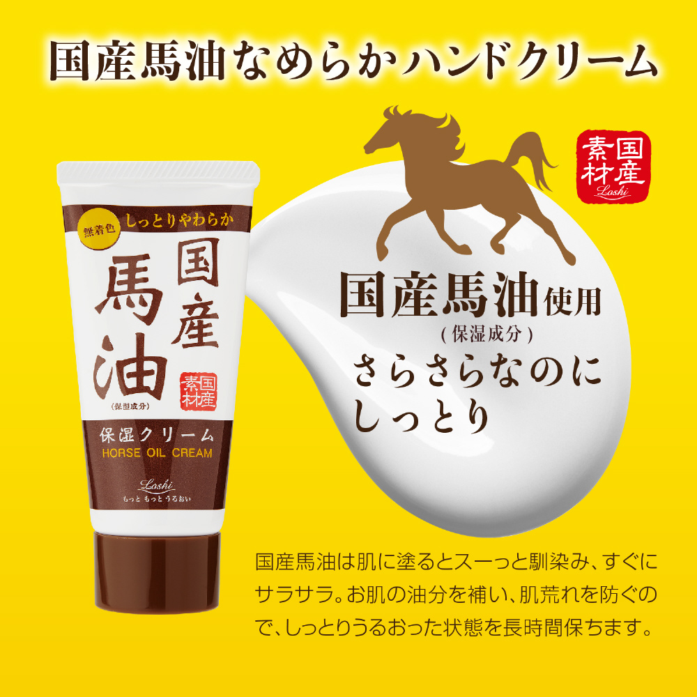 乾燥しがちな手肌に、古来から万能保湿剤として使用される馬油が、潤いを持続させます。