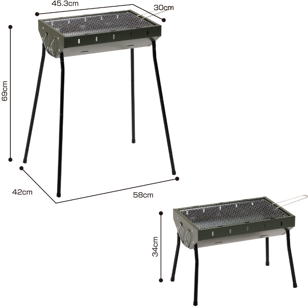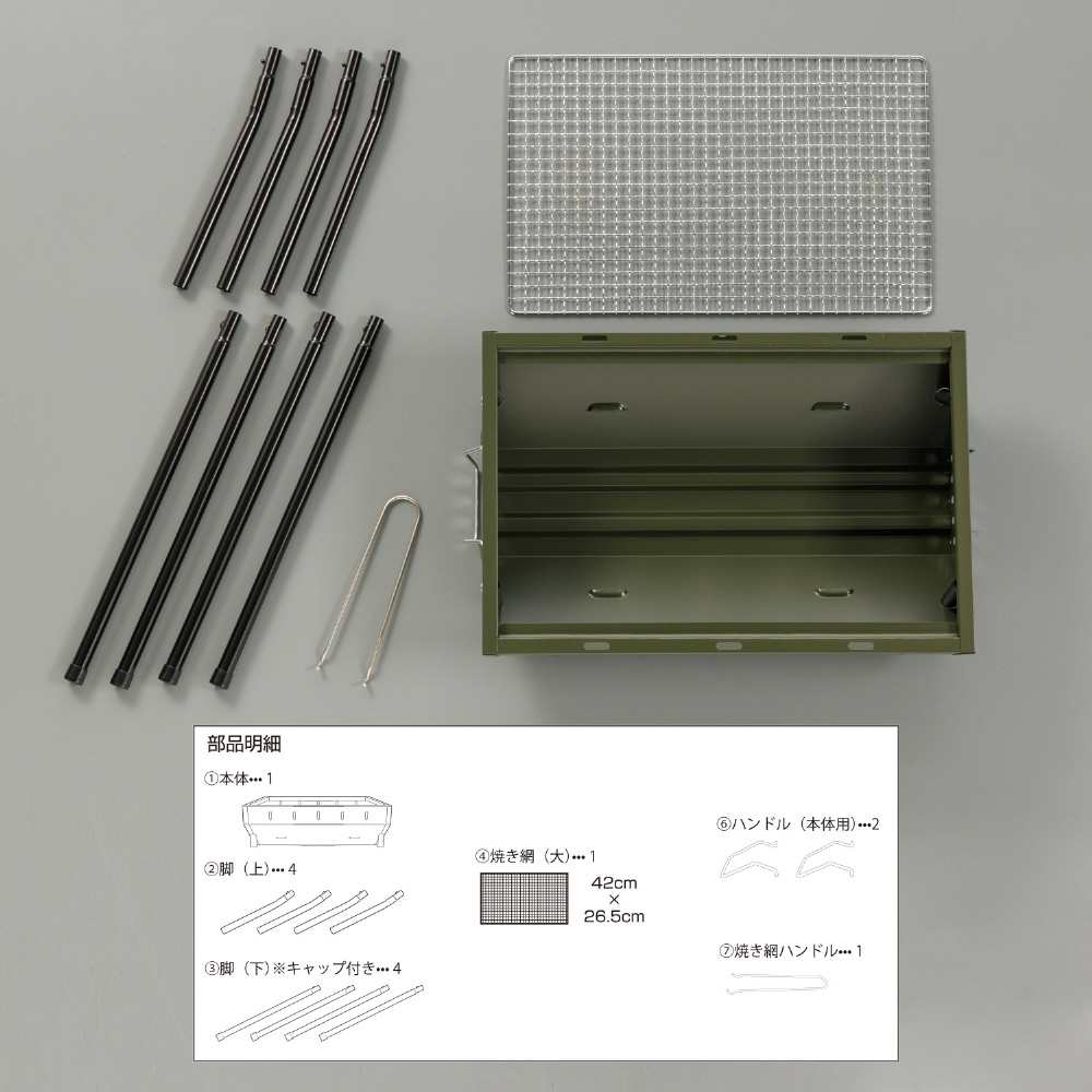 【材 質】本体/スチール(エポキシ塗装)・脚/スチール(クロムメッキ)・ハンドル/スチール(亜鉛メッキ)・焼網/スチール(クロムメッキ)・焼網ハンドル/ステンレス