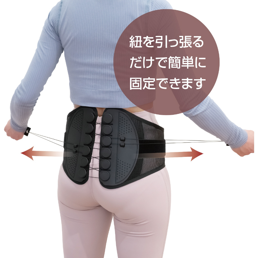 簡単装着で腰、骨盤をしっかりガード。軽く紐を引くだけでベルトがギュッと締り、腰、骨盤をしっかりと固定します。力のあまり無い女性の方や高齢の方でも簡単に装着できます。