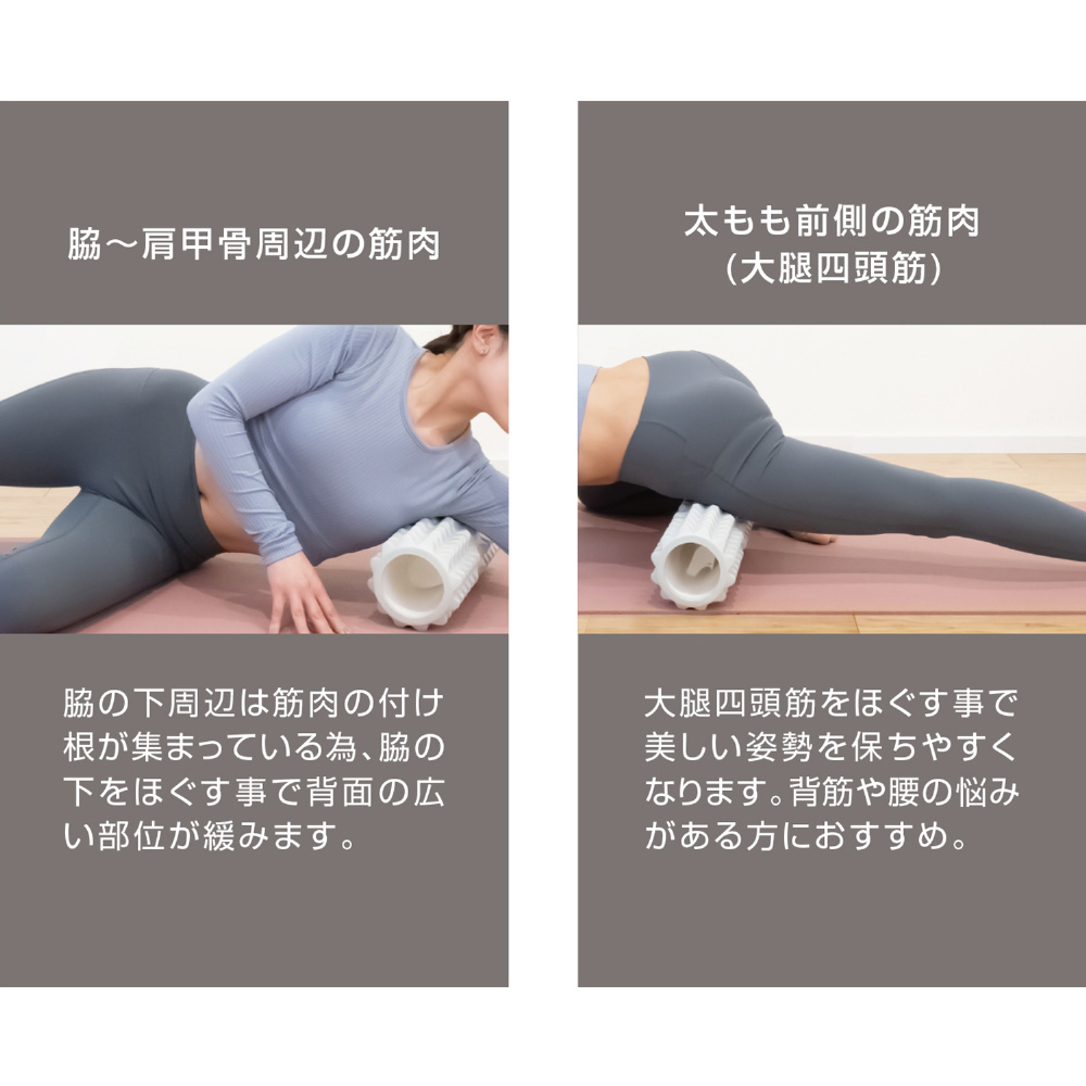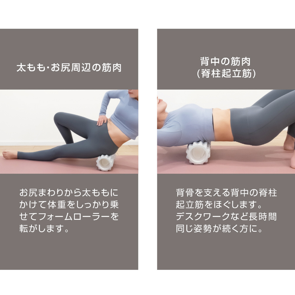 表面の突起と芯の硬さで筋膜ストレッチ。筋膜の硬くなった部分を自宅で手軽にケアできるフォームローラー。