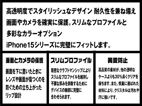 クリスタルクリア保護ケースは、iPhone 15シリーズ全モデルに対応しています。このケースは高透明度を誇り、デバイスの自然な美しさを損なわずに保護します。アルミニウム製カメラフレーム、PC製背面カバー、TPUフレームを組み合わせたスリムなプロファイルが特徴です。