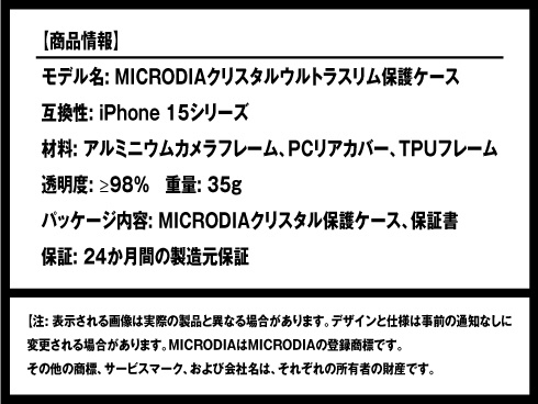 MICRODIA CRYSTALTM GEARケースには、24か月間の製造元保証が適用され、ユーザーに安心感を提供します。パッケージ内容には、ケース本体と保証書が含まれています。このケースは、デザインと実用性を兼ね備えたプレミアムな保護ソリューションを提供し、日常の使用においてもデバイスを安全に保ちます。