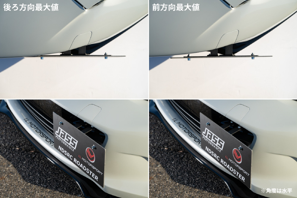 牽引フックボルト部分に装着。角度調整,左右オフセット機能付。ナンバープレートを固定するボルト類は付属していないため別途ご用意ください。2021年4月1日以降登録の車両は角度の範囲が定められていますのでご注意ください。