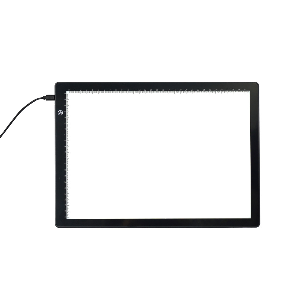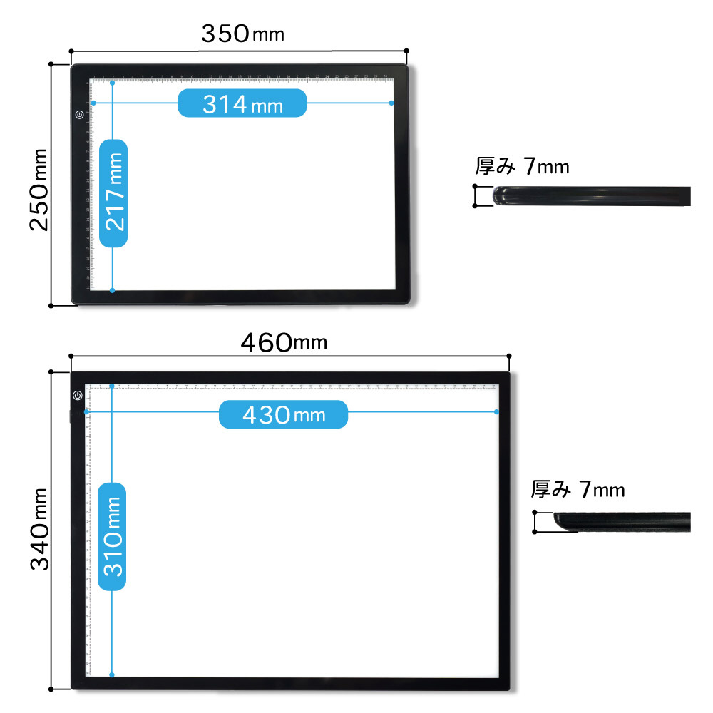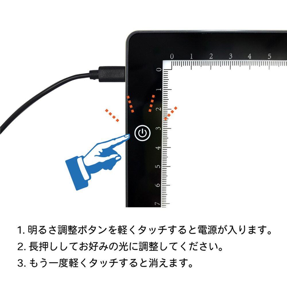 コピー用紙から水彩紙のような厚めの用紙まで、光源はLEDライト、電源ボタンを長押しして簡単に調節が可能です。無段階調光なので好きな光の強さに微調整できます。