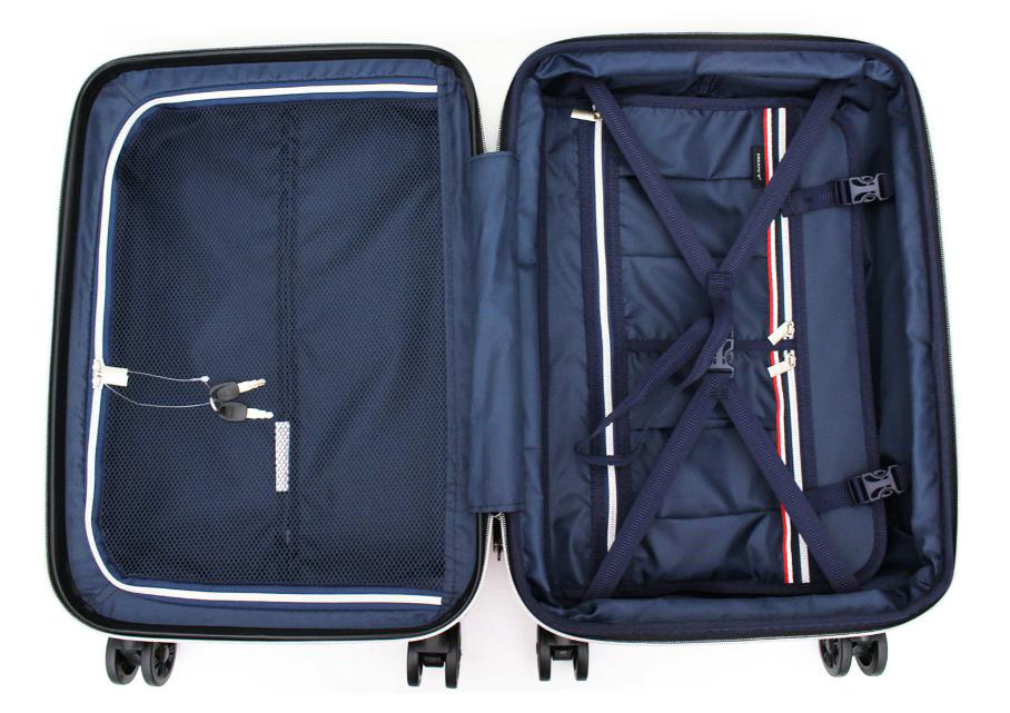荷物やお土産が増えても安心の『拡張機能』搭載。さらに、内装の仕切りも拡張する(実用新案取得済み)ので本体拡張時もしっかりとお荷物を押さえます。蓋側の内装はファスナー仕様、胴側の内装は荷崩れを防止するクロスベルトと間仕切り付き。