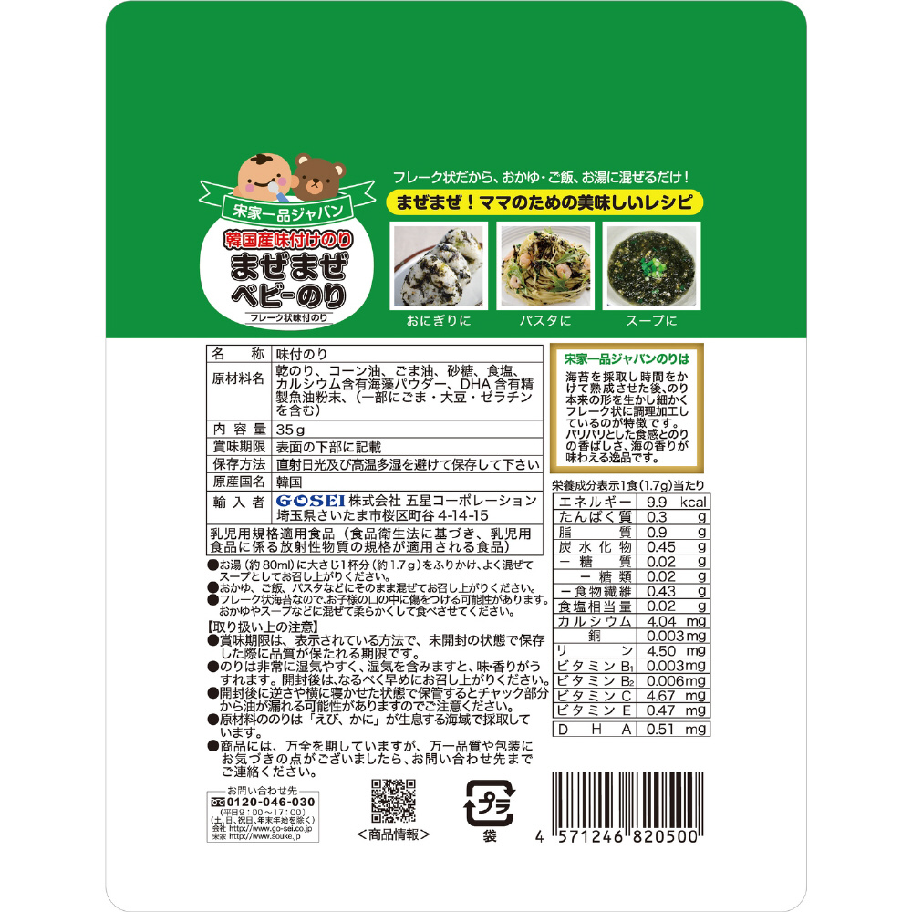 原材料名 乾のり、コーン油、ごま油、砂糖、食塩、カルシウム含有海藻パウダー、DHA含有有精製魚油粉末(一部にごま、大豆、ゼラチンを含む)