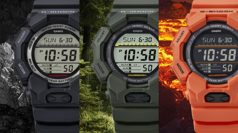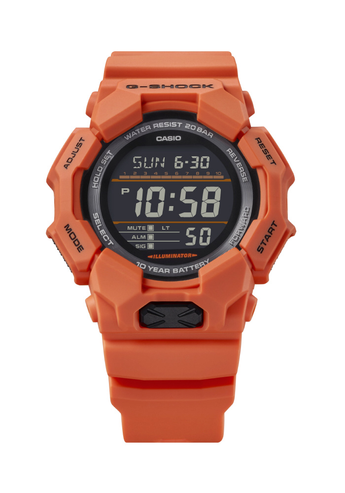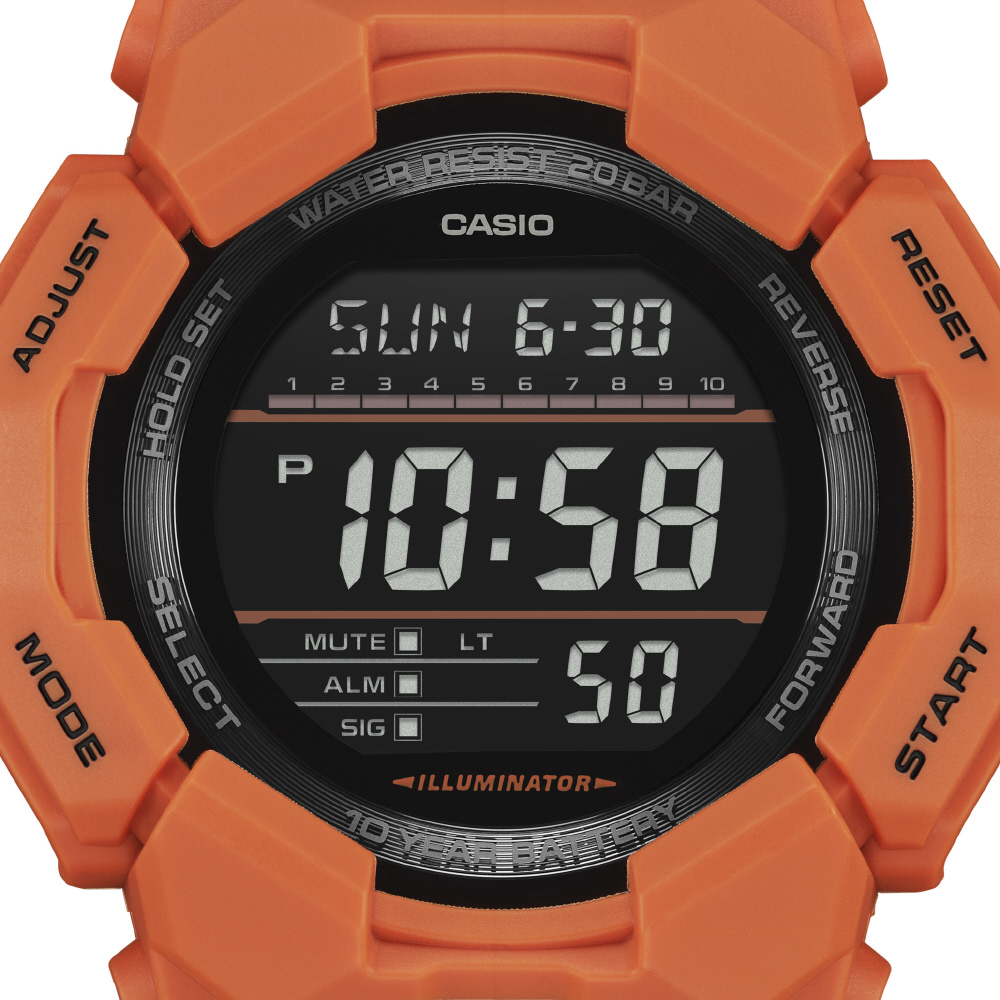 ワイドフェイスとビッグケースで、10年バッテリーを搭載したデジタルモデルのGD-010とデジタルアナログコンビモデルのGA-010は、ワールドタイム、ストップウオッチといった基本機能をはじめ、大型フロントボタンで操作しやすいスーパーイルミネーターにより暗闇での視認性も確保します。