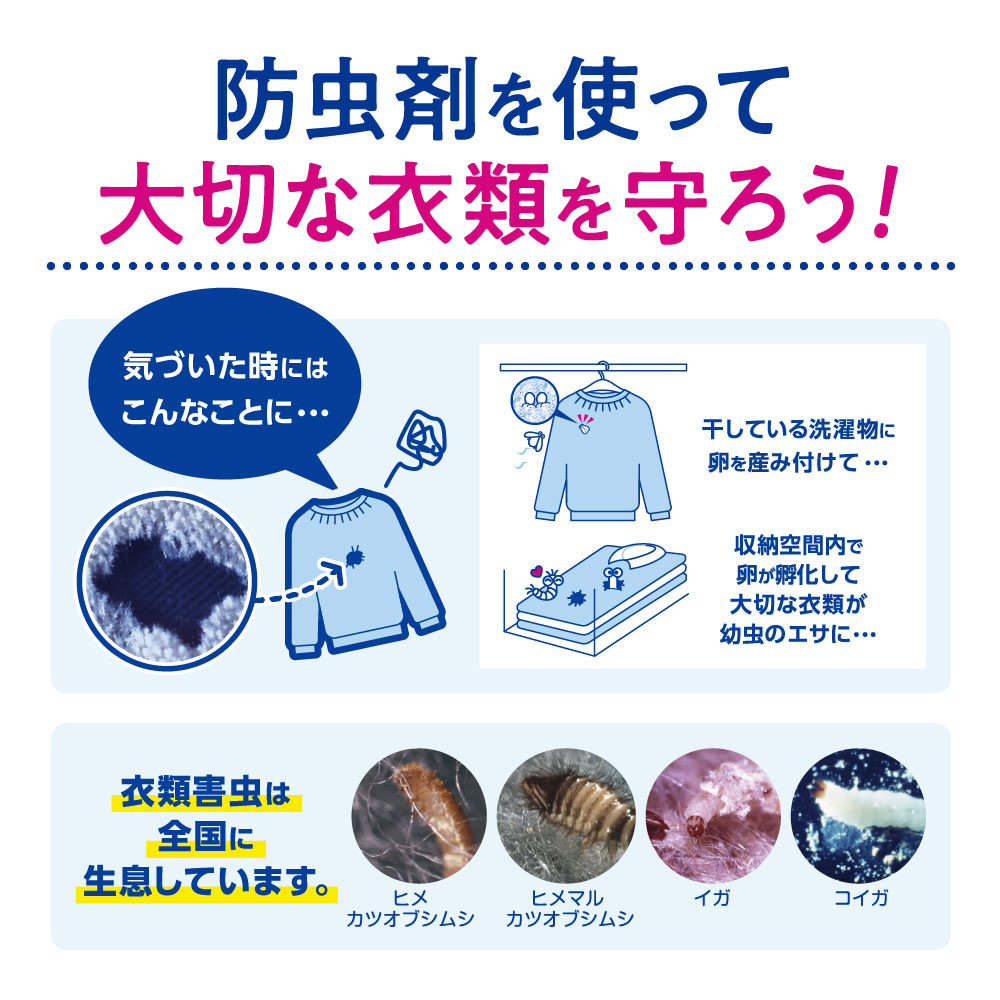 ●せんいの防虫に加え、気になるダニを収納空間内に寄せつけにくくします。(パラジクロルベンゼンの効果)※収納空間内に屋内塵性ダニを寄せつけにくくする効果を確認しています。※マダニやイエダニを対象とした製品ではありません。