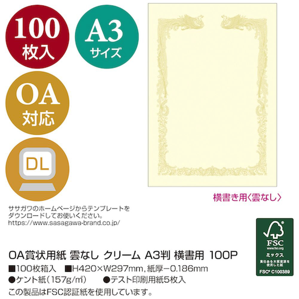 OA賞状用紙 A3判 横書用 クリーム(雲なし) 10-1488