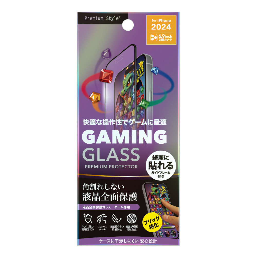 iPhone 16 Pro Max 液晶全面保護ガラス 角割れ防止PETフレーム ゲーム特価/ Premium Style 指紋・反射防止 PG-24DGLF05GM
