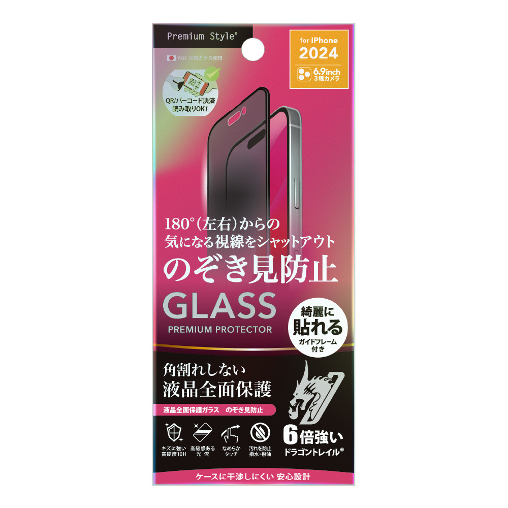 iPhone 16 Pro Max 液晶全面保護ガラス 角割れ防止PETフレーム Dragontrail Premium Style 覗き見防止/高光沢 PG-24DGLF03MB