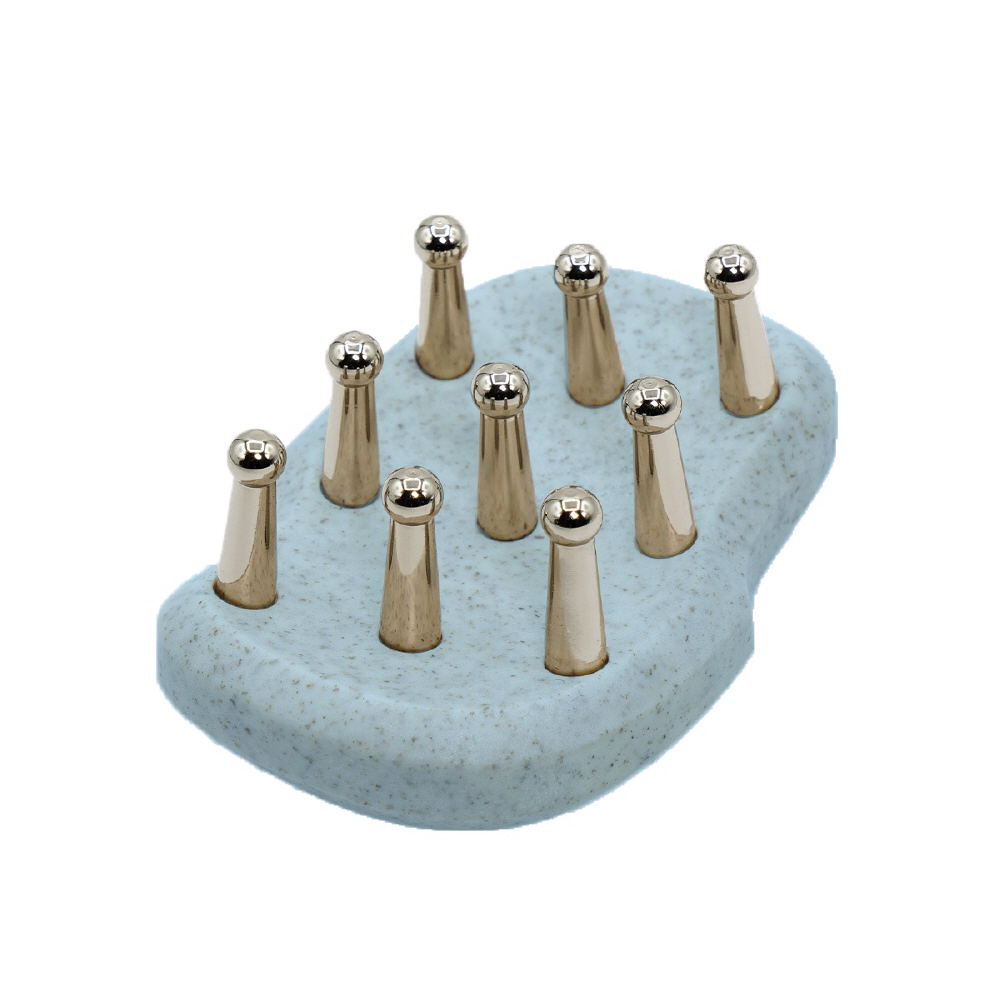 ステンレスの9の突起が頭部筋膜に深く入り込みマッサージ効果を高める筋膜リリースギア。