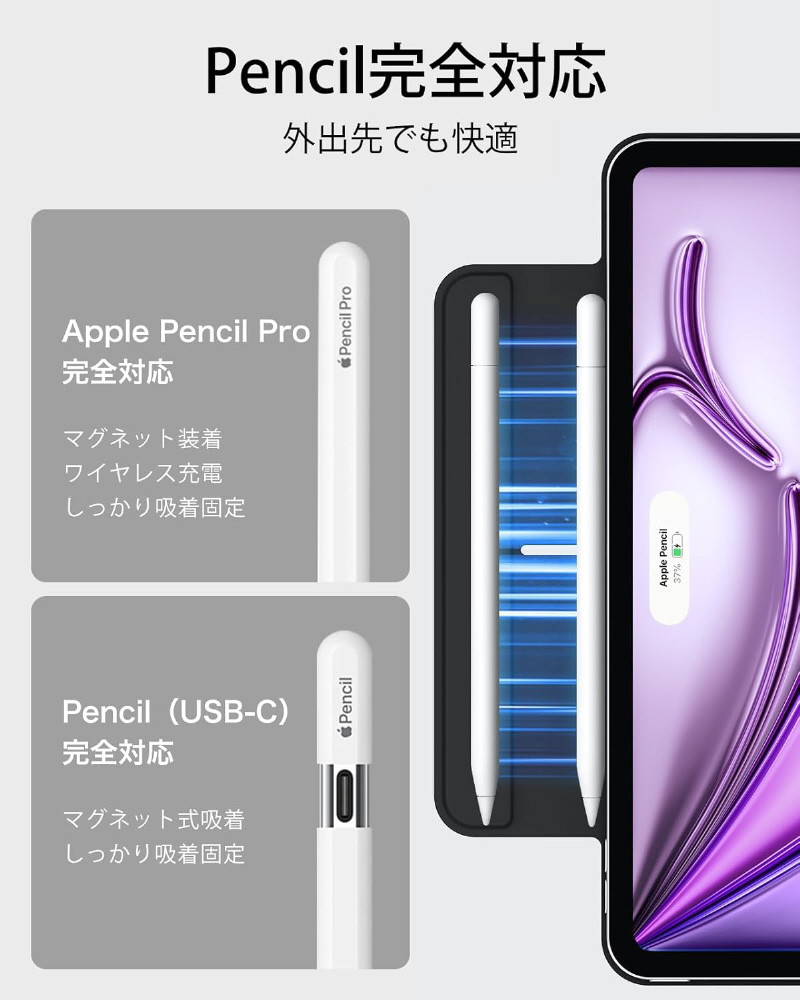 Pencil Proへ完全対応かつ、磁気充電用の側面の溝と、Pencilをしっかりと固定するマグネットクラスプを備えています。