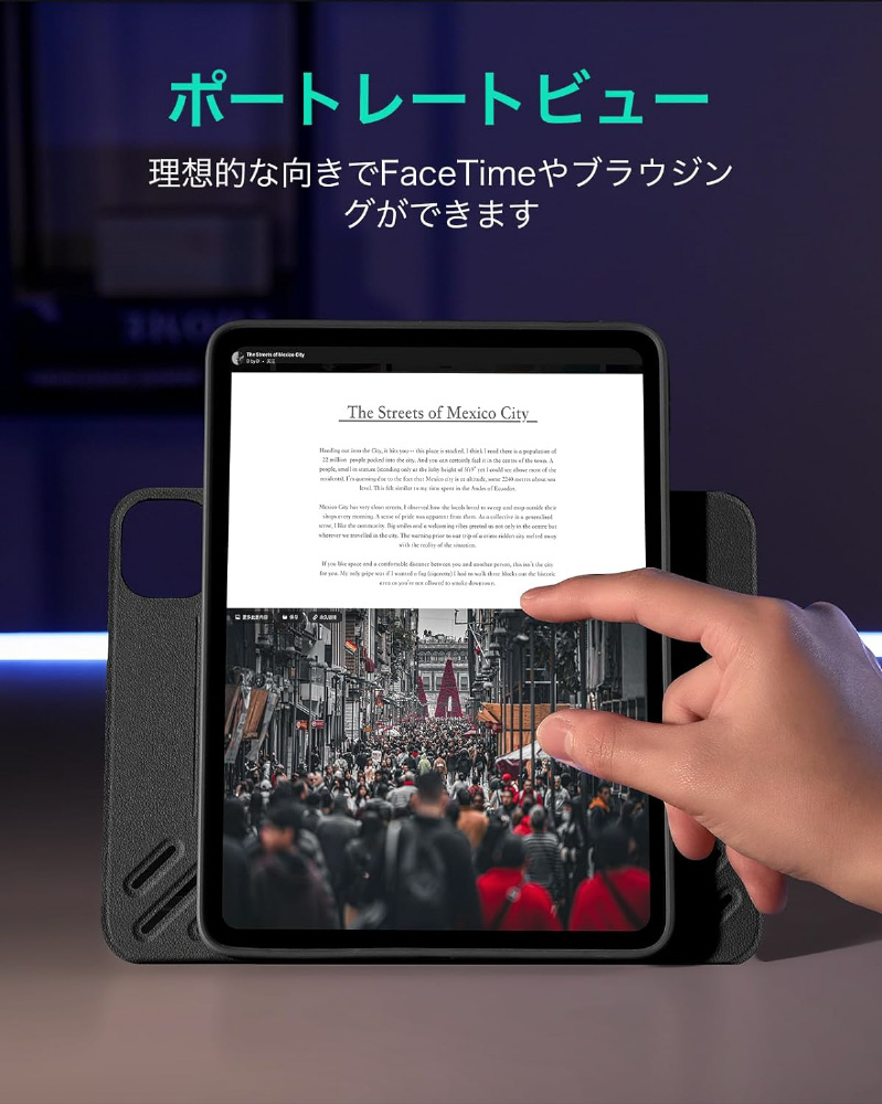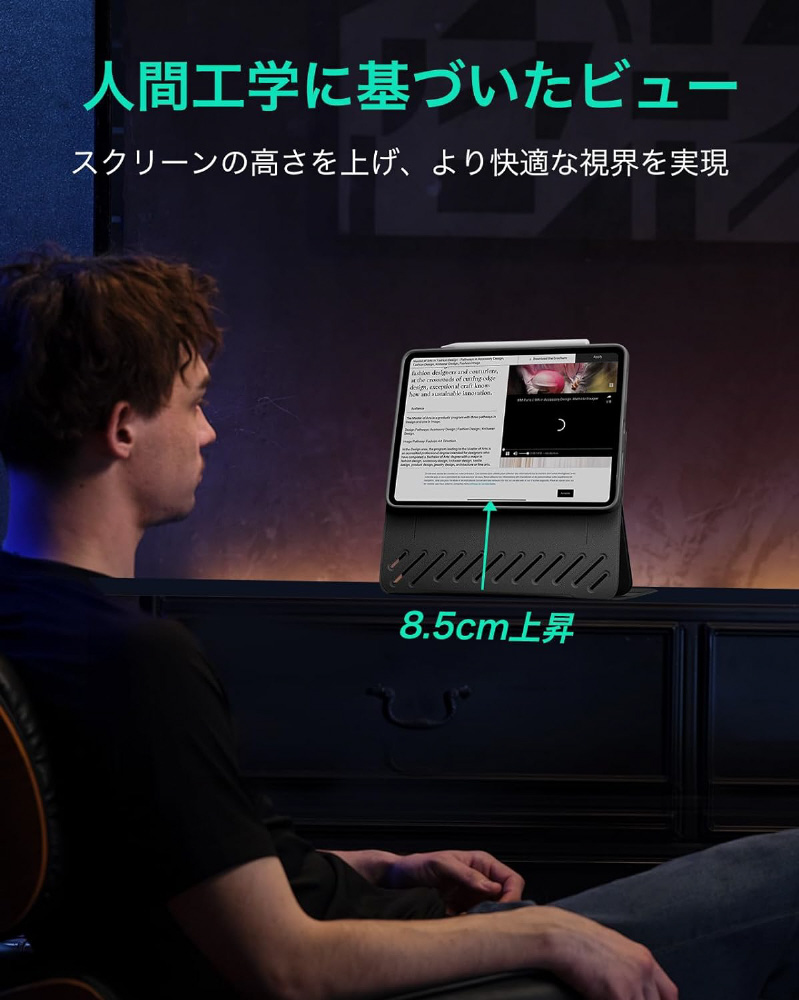 iPad Proをより自然な目線に近い位置で見ることができ、長時間の使用でも快適な姿勢を保つことができます。