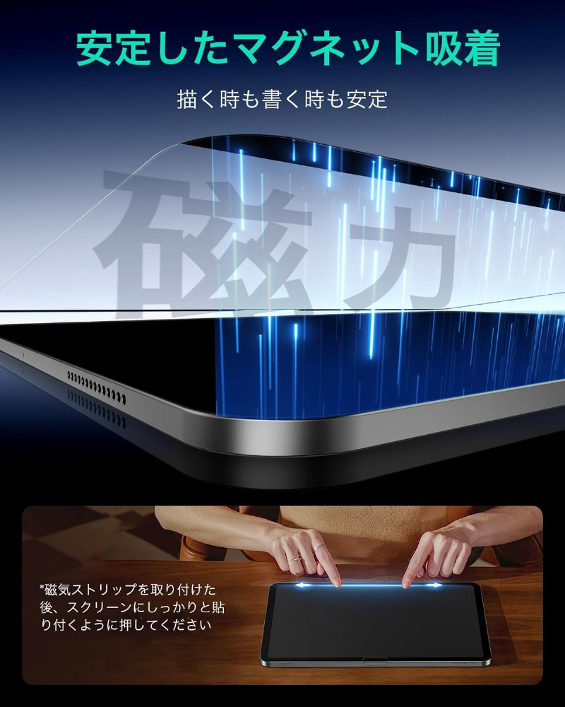 マグネットエッジは、必要時にiPadのスクリーンに簡単に取り付けることができ、元ディスプレイの完璧なビューへ戻すときは、素早く取り外せます。