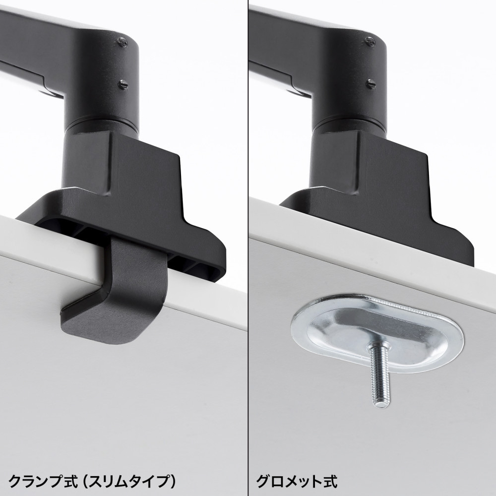 ■クランプ金具の奥行きがわずか38mmの薄型ショートクランプタイプなので、バックパネルのあるデスクにも取り付けしやすくなっています。
