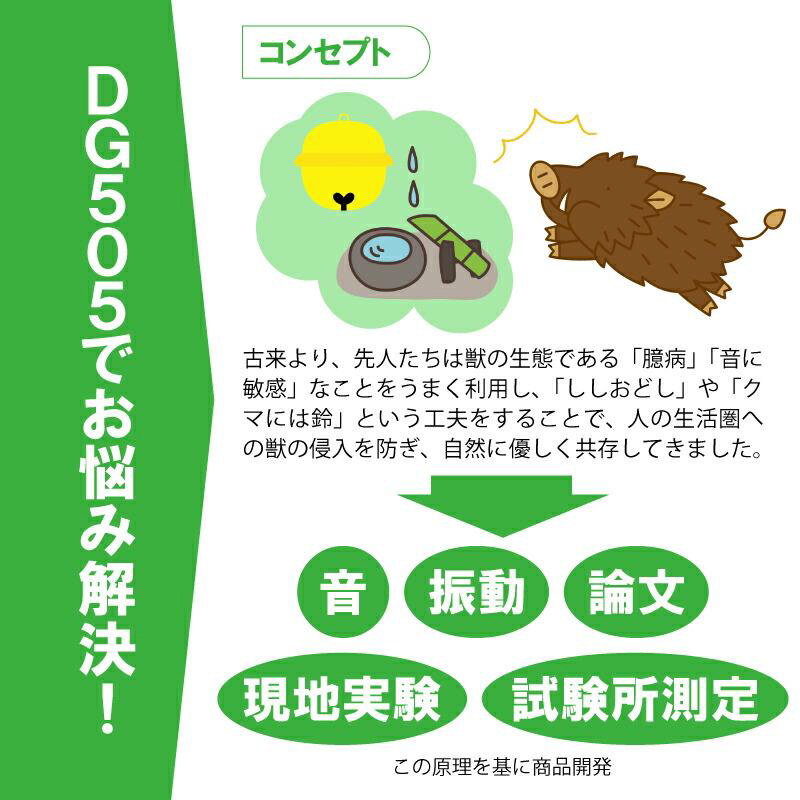 イノシシびっくり DG505は、『イノシシ・クマ・タヌキ』などの害獣対策の警報器です。