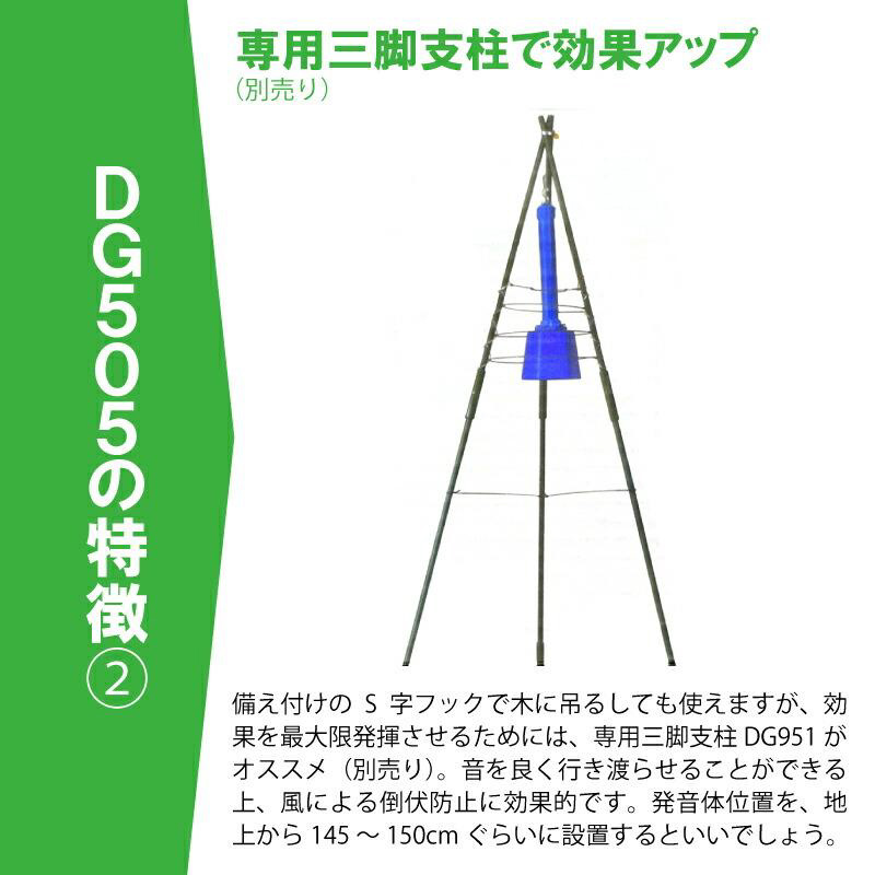 備え付けのS字フックで木に吊るしても使えますが、効果を最大限発揮させるためには、 専用三脚支柱DG951がオススメ(別売り)です。