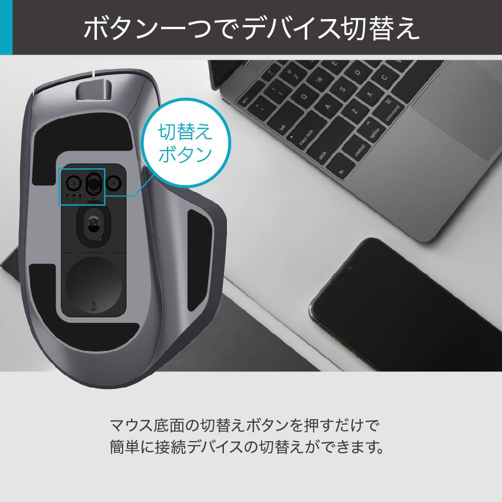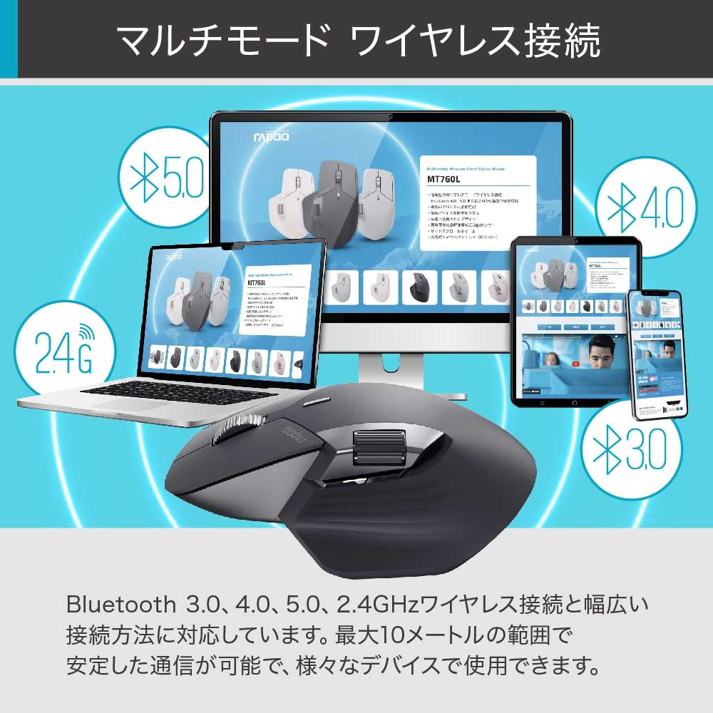 Bluetooth 4.0、5.0または2.4GHzワイヤレス接続に対応しています。1台のマウスで最大4台のデバイスを切替えながら操作できますので、作業効率が向上します。Bluetooth 4.0、5.0 または2.4GHz経由で接続可能