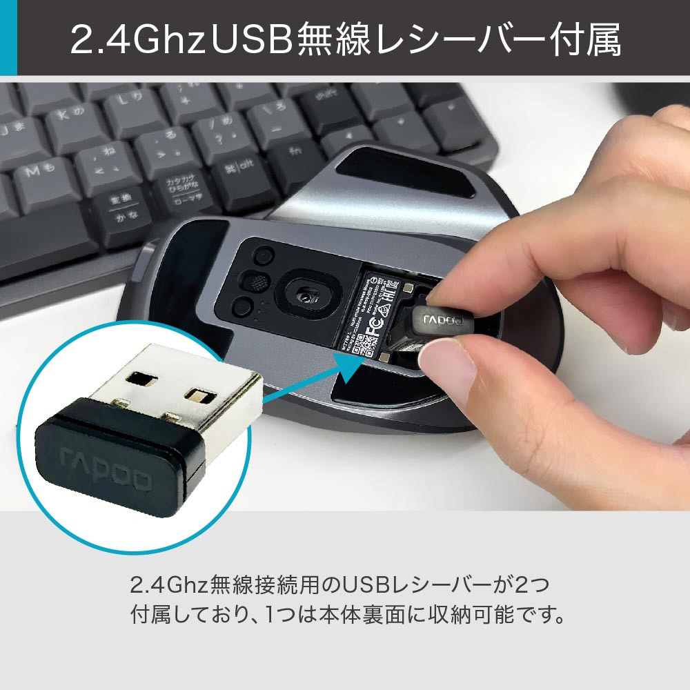 2.4GhzUSBレシーバーが2台付属されておりレシーバーを取り付けた2台のデバイスの間で、マウスをスライドするだけで、テキストや画像、フォルダーをシームレスに移動させることができます。Windowsのみ使用可能。別途ソフトをダウンロードする必要があります。データの移動は親機から子機への一方通行のみです。