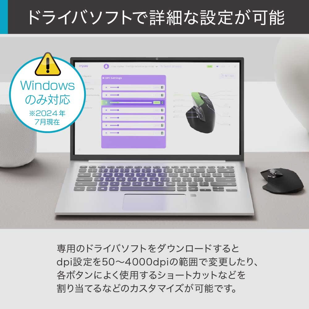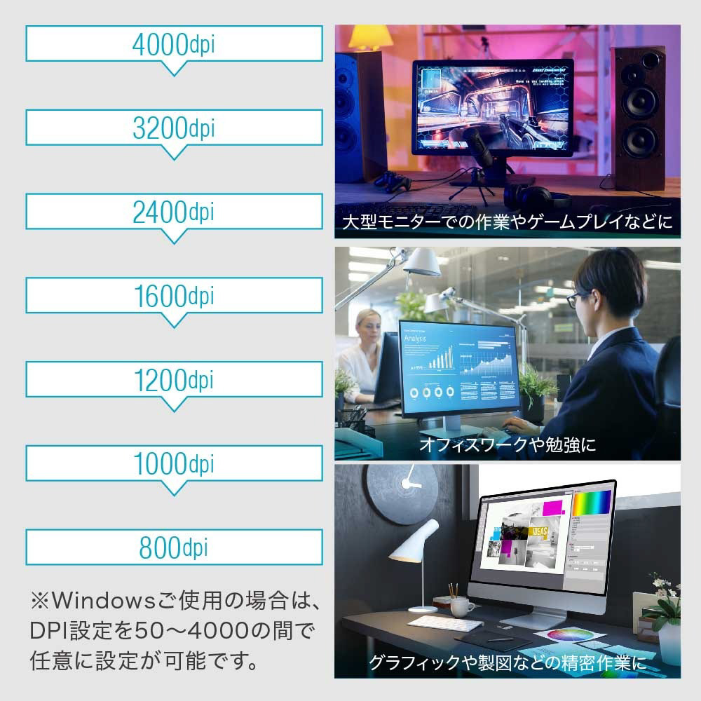 高解像度dpiセンサーにより、スムーズな操作感を実現。反応精度にムラがなく滑らかなカーソル移動が可能です。解像度を800〜4000dpiの7段階調節可能で、操作するデバイスの解像度が変更になっても違和感なく操作できます。Windowsのみ使用可能です。