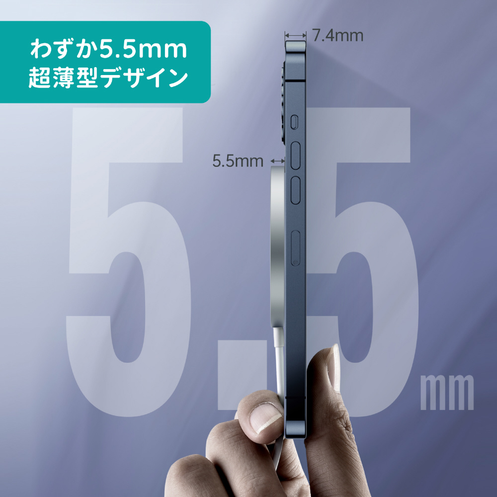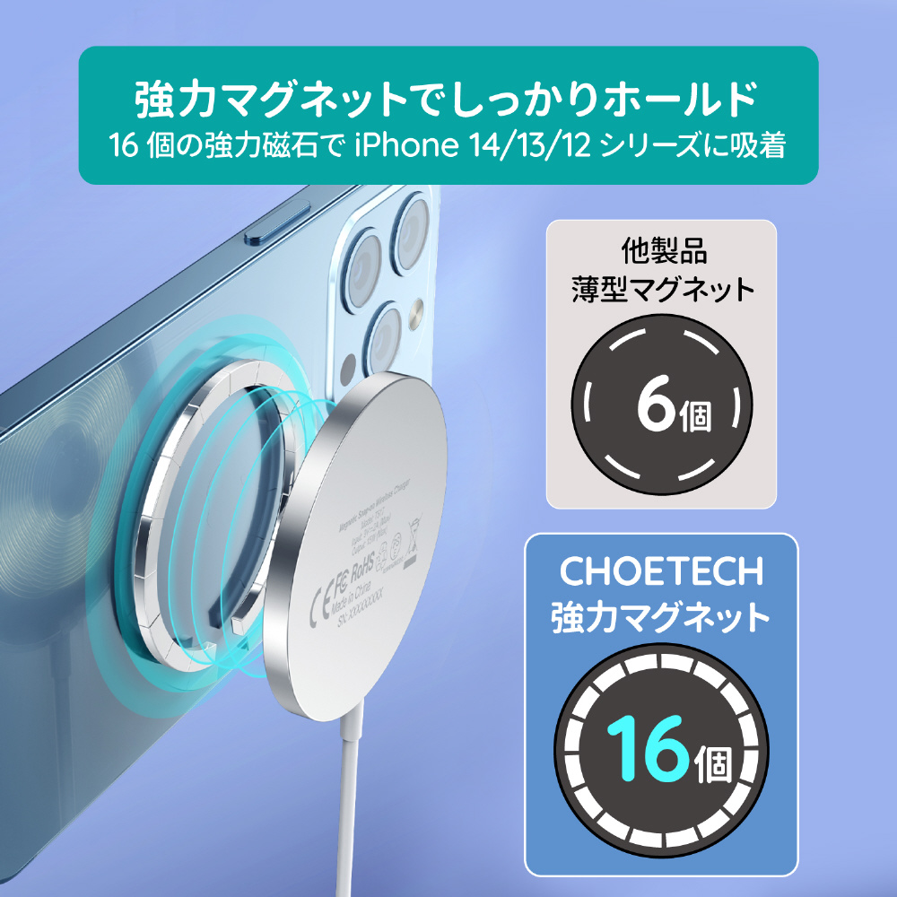 16個強力磁気で吸着して、スマホを落ちる心配はいりません。ケースをつけたままでも充電ができるように設計されています。ただし、約6mm以上の厚みがあるケース、金属製や磁気ケース、およびクレジットカードなどは、充電前に取り外してください。