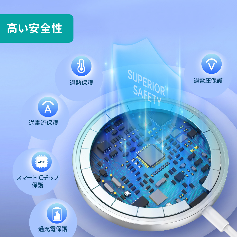 過電圧保護、過熱保護、ショ一ト防止、異物検知、過充電防止などマルチ保護機能を備えており、お使いのスマホを守ります。安全なトリクル充電を行い、スマートフォンをワイヤレス充電器に一晩中置きっ放しにしても大丈夫です。