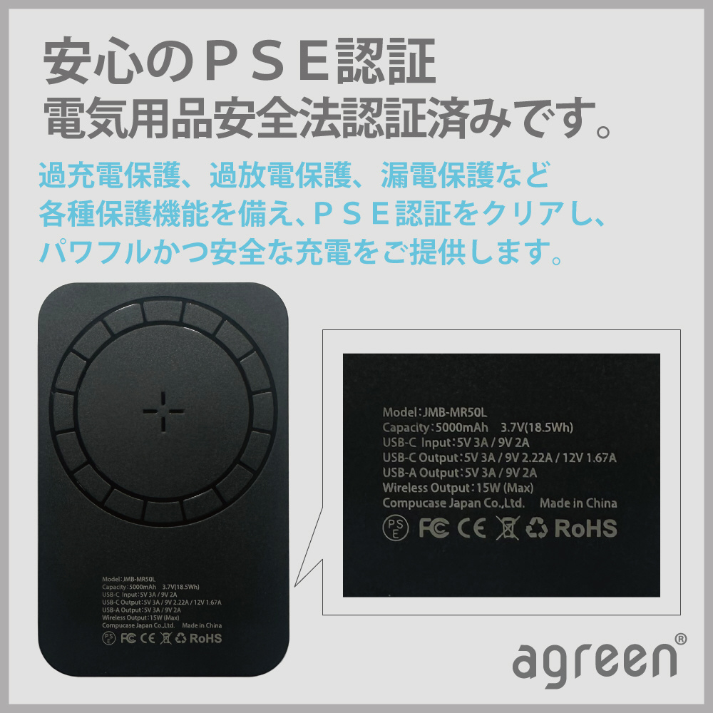 出力 マグセーフワイヤレス15W(MAX)、Type-C (PD) 5V 3A / 9V 2.22A / 12V 1.67A(PD20W)、USB-A 5V 3A / 9V 2A(18W)