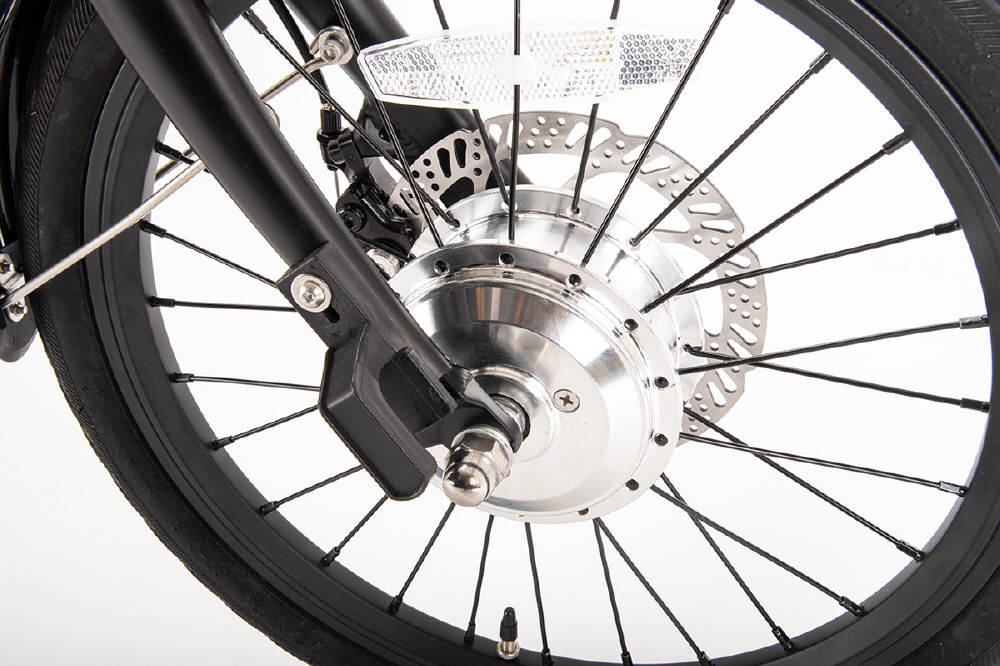 前輪はディスクブレーキ、後輪にはシマノ製ローラーブレーキを搭載、雨の日でも安心して走行可能です。