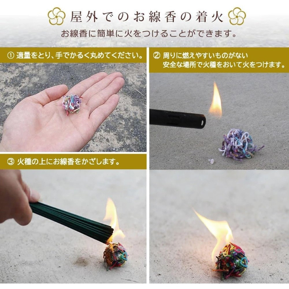 仕様1 内容量:約50g、素材:様々な太さの綿糸に高純度なロウ(パラフィンワックス_SP - 1039)を染みこませた着火剤