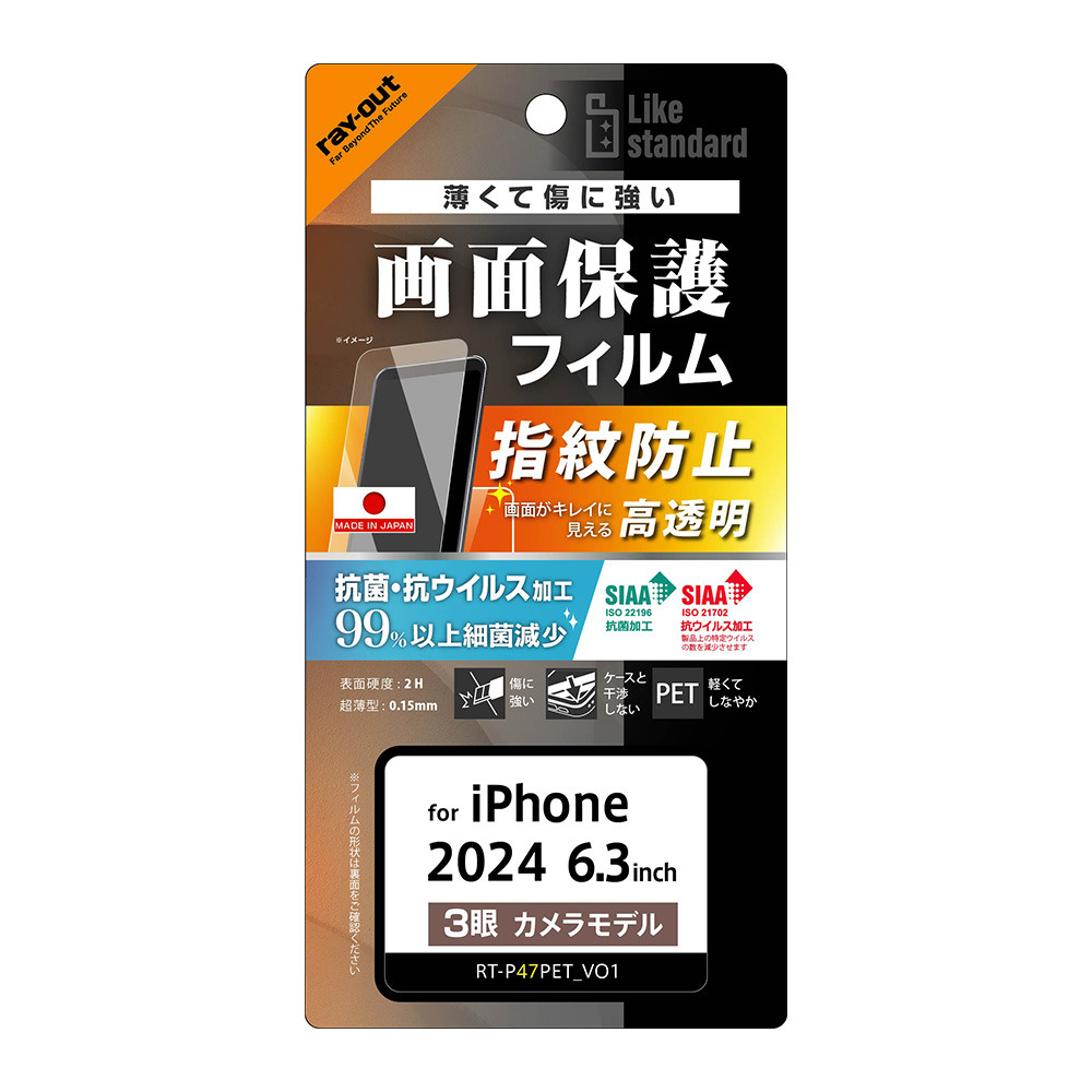 iPhone 16 Pro PETフィルム 光沢 抗菌・抗ウイルス 平面保護 指紋防止