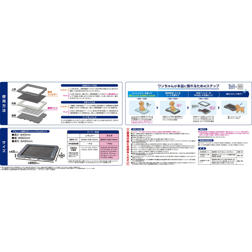 ・抗菌ドライフィルターと強力吸収・消臭マットの2層構造で3日間交換無しでもニオわない犬用トイレシステムです。