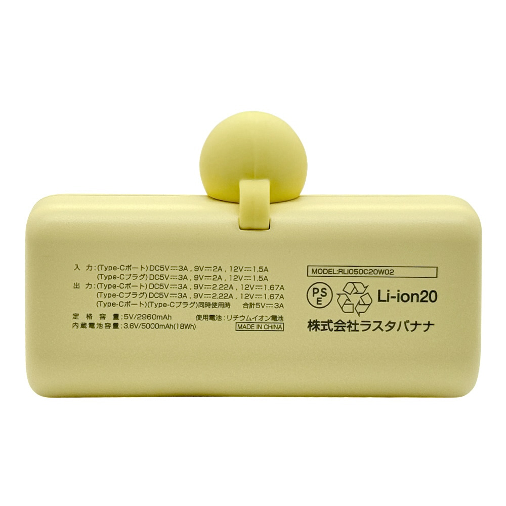calon 5000mAh Type-C直付けモバイルバッテリー Cオス Cメス 20W出力 ライトイエロー ラスタバナナ ライトイエロー RLI050C20W02LYL [USB Power Delivery対応 /2ポート]