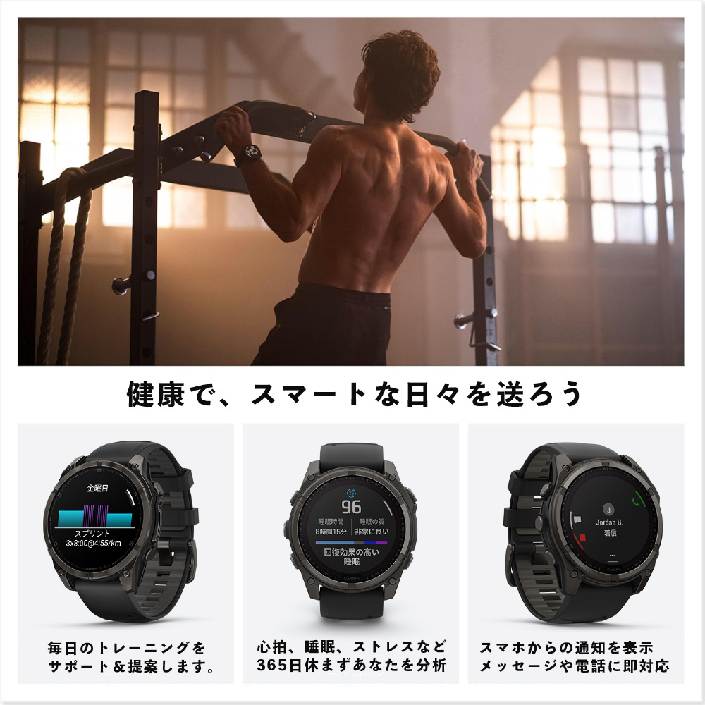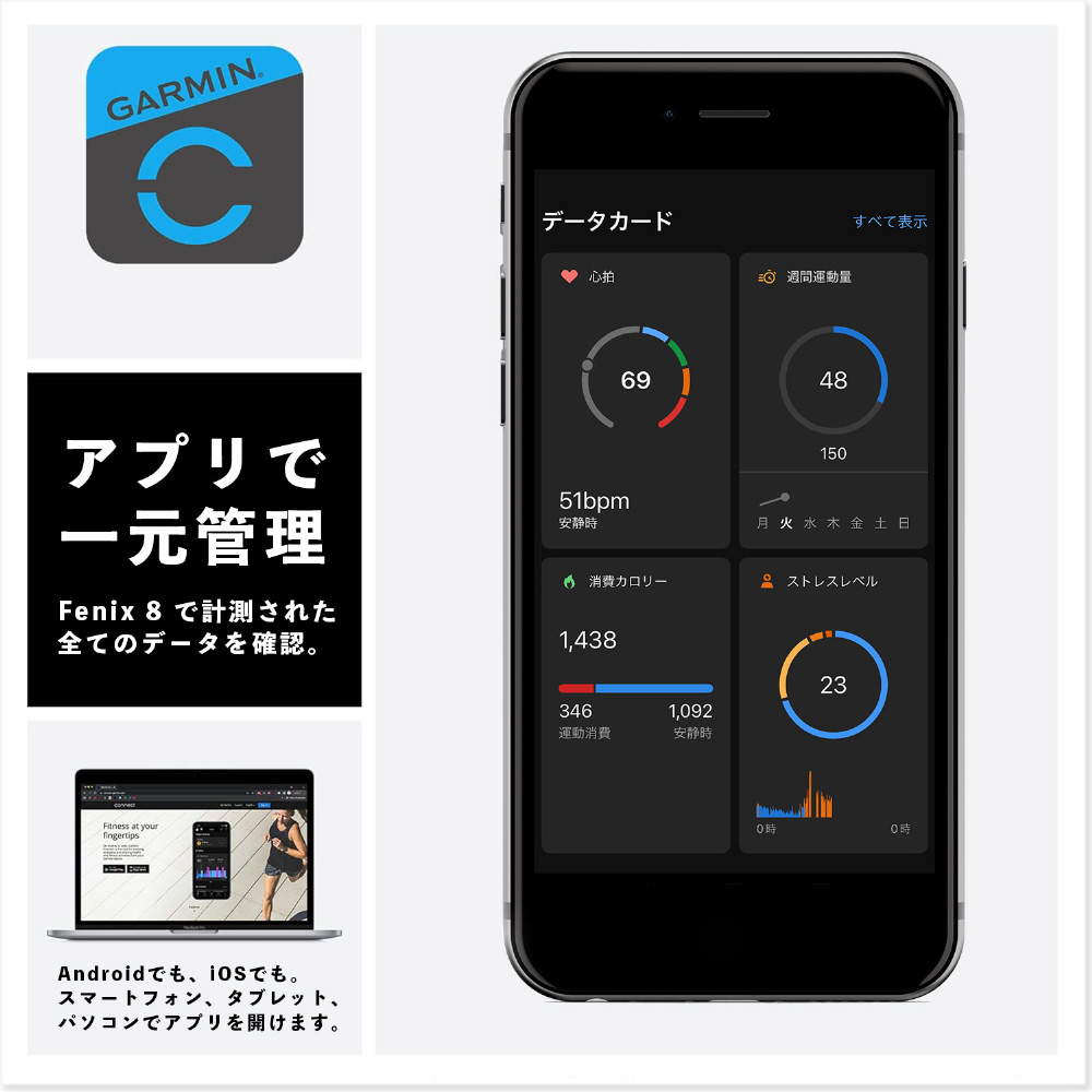 fenix(フェニックス) 8はGarminが誇るフラッグシップスマートウォッチです。毎日の健康管理やスポーツの記録まで、ウォッチがあなたのデータを計測・分析し、あなたに合ったアドバイスを提案します。