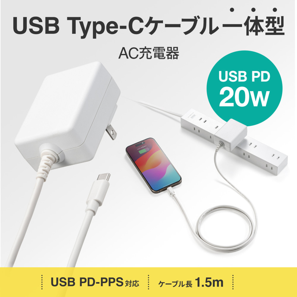 iPhone、スマートフォンに急速充電できるUSB Power Delivery規格20Wの出力に対応したUSB Type-Cケーブル一体型AC充電器。
